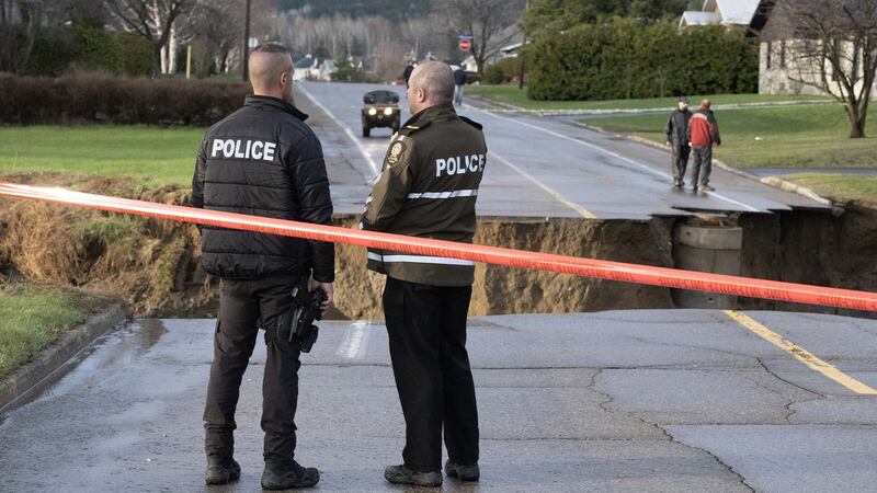 Deux policiers de la Sûreté du Québec (SQ) sécurisent une route endommagée par les eaux de crue le lundi 1er mai 2023 à Baie-Saint-Paul, au Québec. | Crédit - Jacques Boissinot, la Presse canadienne