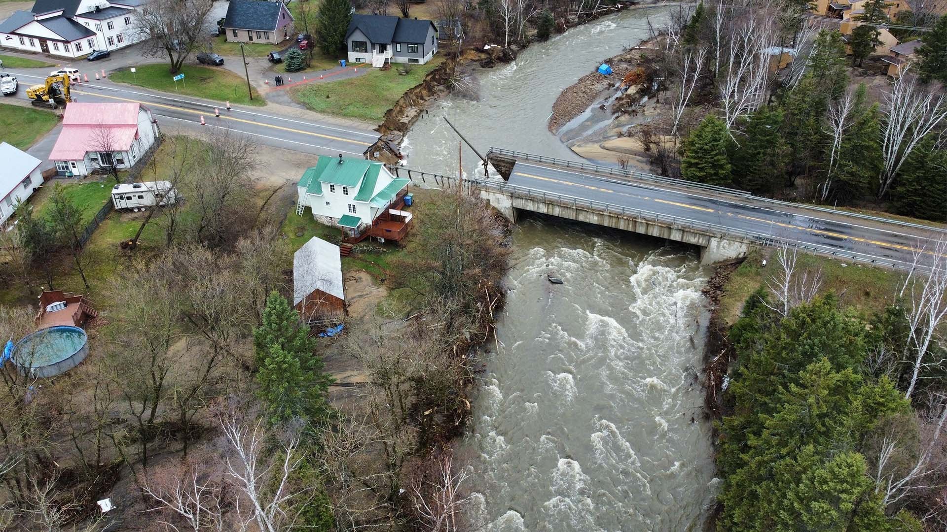 Plusieurs roulottes de voyages ont été emportées par le fort courant de la rivière des Mares, lundi, menaçant par le fait même la structure d'un pont.