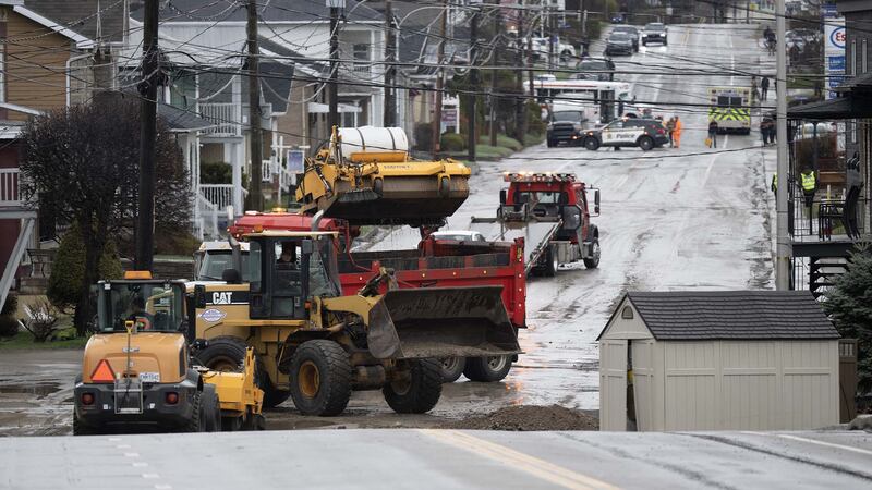 Des travailleurs nettoient la boue et les débris de la route 362, le mardi 2 mai 2023 à Baie Saint-Paul au Québec. | Crédit - Jacques Boissinot, la Presse canadienne