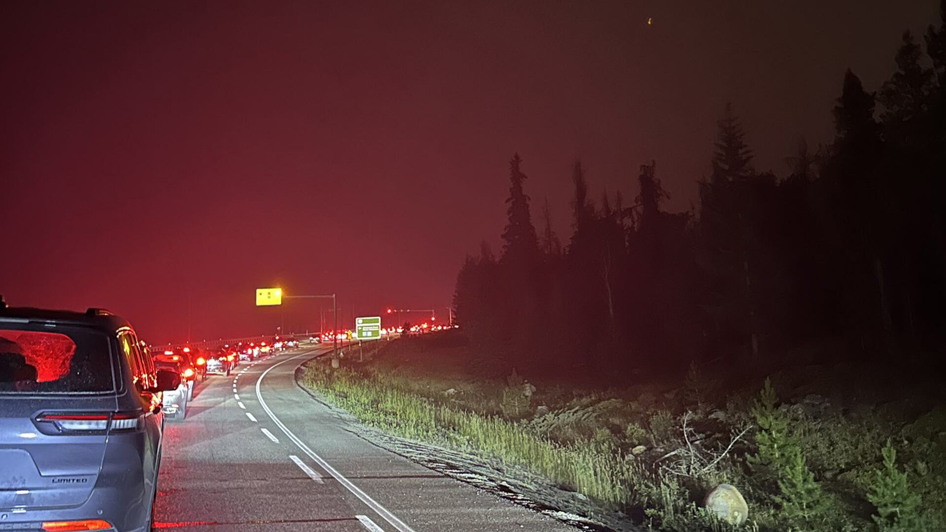 Lundi soir, des photos et des vidéos partagées sur les réseaux sociaux ont mis en lumière un cortège nocturne de voitures et de camions, pare-chocs contre pare-chocs, phares allumés, feux arrière rouges allumés, voitures avançant, s'arrêtant, démarrant, se traînant à travers des vrilles tourbillonnantes de fumée âcre vers la Colombie-Britannique.