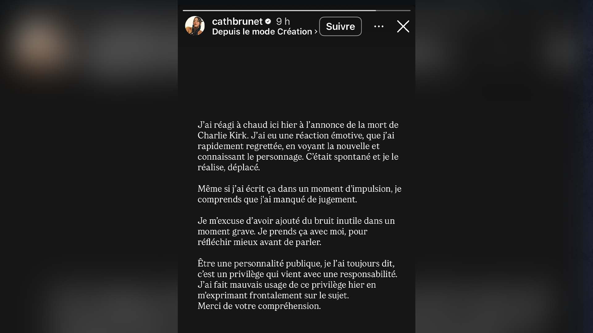 La comédienne Catherine Brunet a présenté des excuses jeudi après avoir «réagi à chaud» à la mort de l’influenceur conservateur Charlie Kirk mercredi.