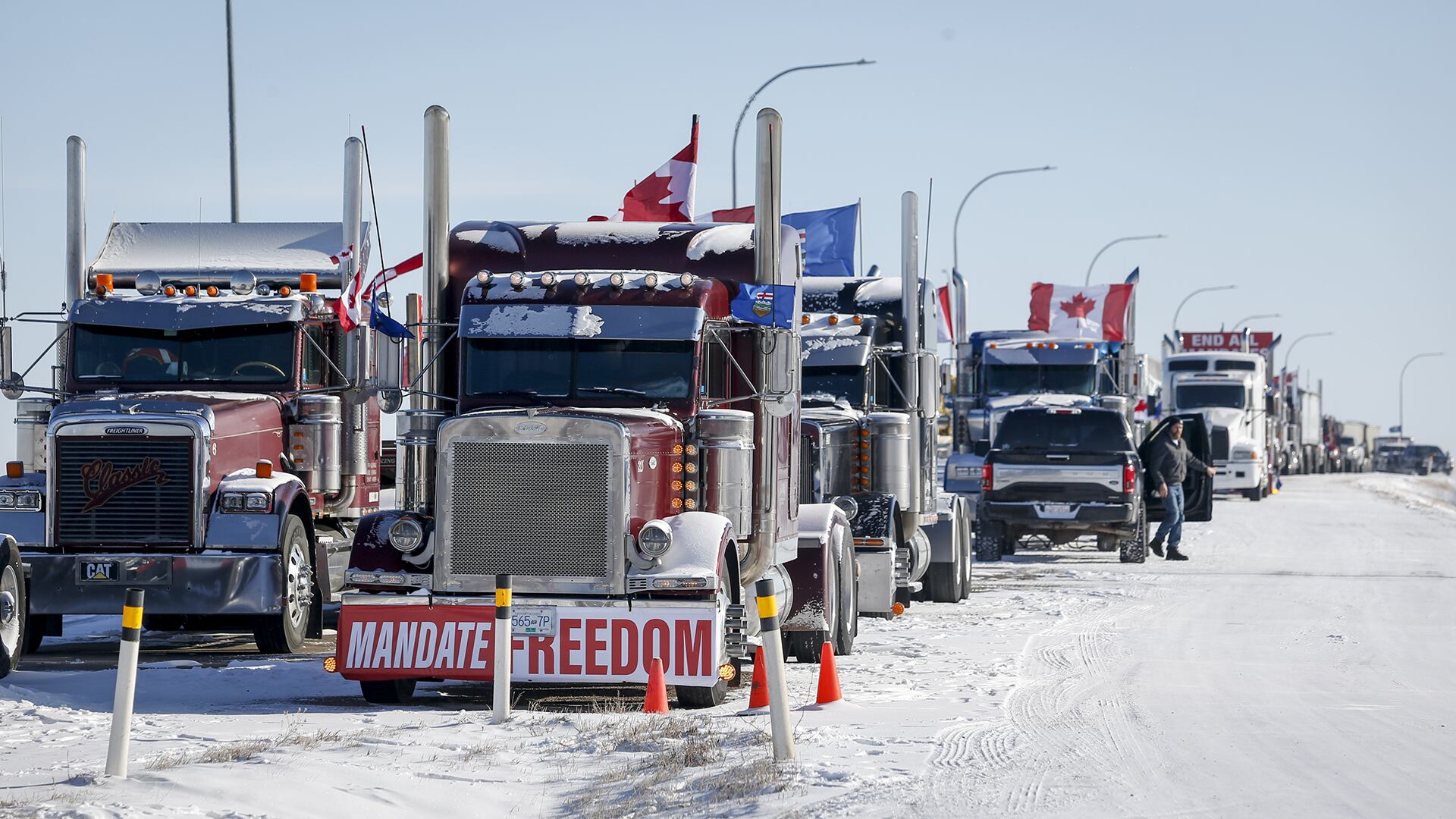 Des semi-remorques et des manifestants ont barré la route à Coutts, en Alberta, alors qu'ils manifestaient contre la vaccination obligatoire, retenant M. Singh pendant près de deux jours. Il n'était que l'un des conducteurs de centaines de véhicules arrêtés par le barrage.
