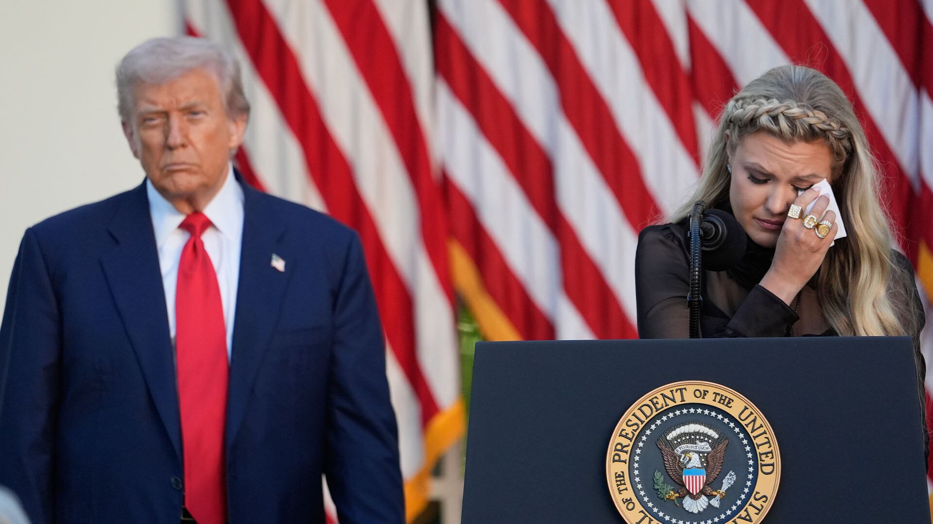 «À tous ceux qui regardent. Ceci n'est pas une cérémonie, c'est un ordre de marche», a dit Erika Kirk, qui a repris les fonctions de son défunt mari à la tête de l'organisation de jeunesse de droite radicale Turning Point USA.