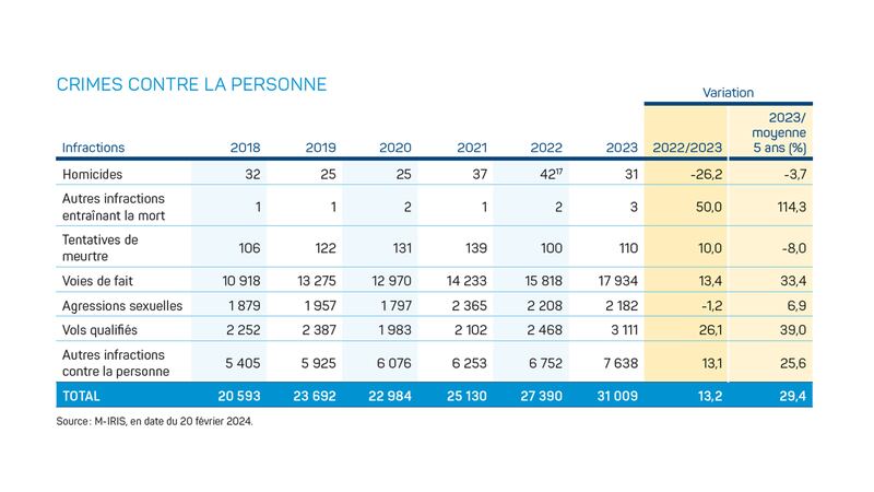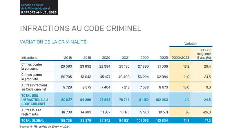 Le total des infractions au code criminel s’est élevé à 102 063, une hausse de 12% par rapport à 2022 (91 152 infractions). Le bilan général des infractions au Code criminel a connu une hausse de 24,5% en 2023 par rapport à la moyenne des cinq dernières années. Plus spécifiquement, les crimes contre la personne ont augmenté respectivement de 29,4% durant cette période.