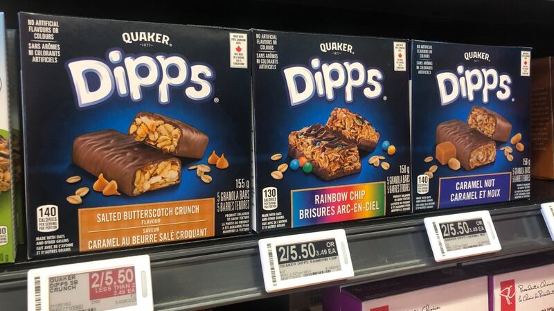 Une barre de granola aux pépites de chocolat Quaker Dipps coûte 2$ pour un paquet de cinq chez Dollarama et 3,49$ chez Loblaws. Ou deux boîtes pour 5,50$.
