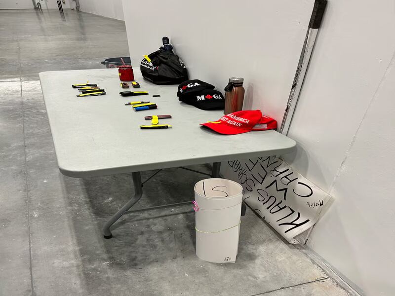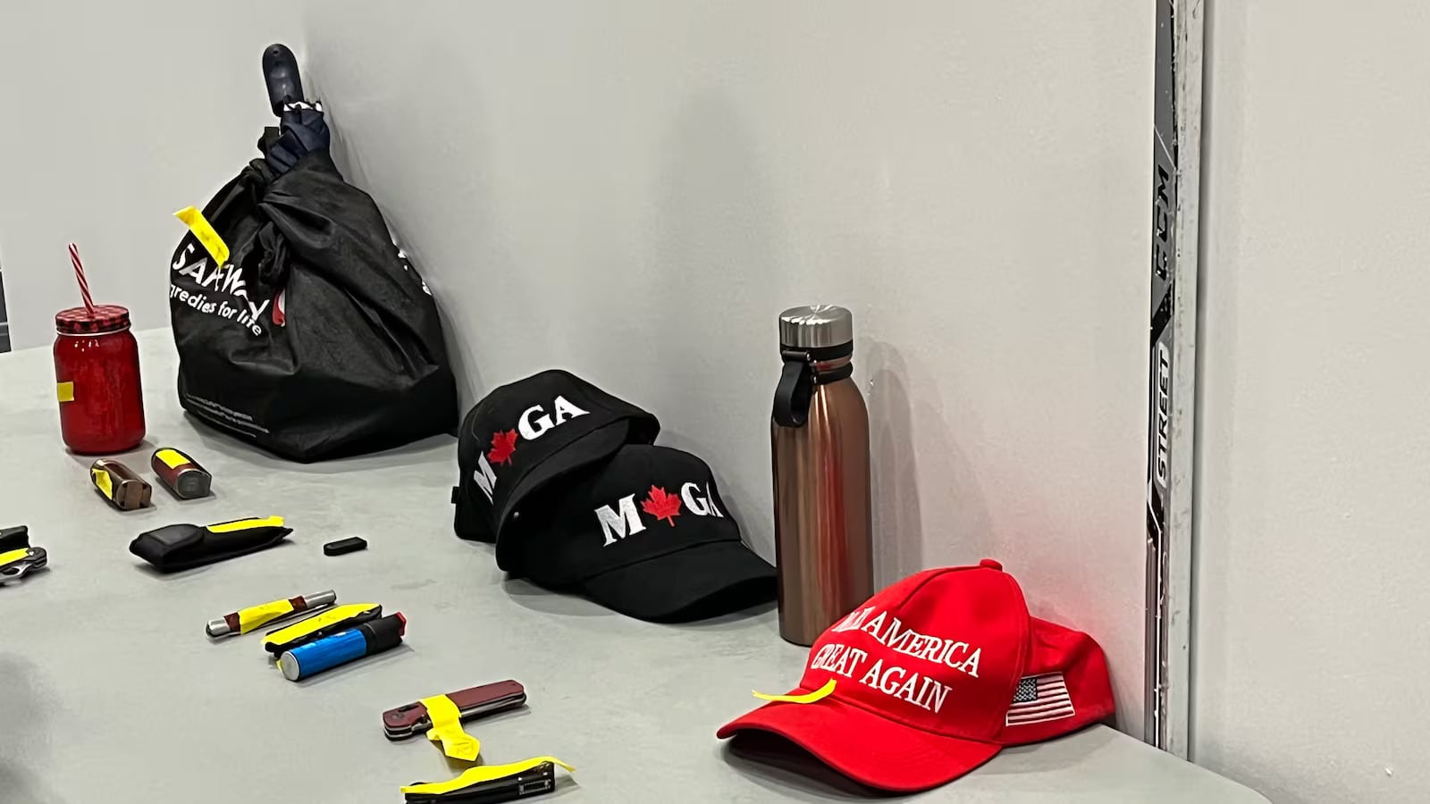 Près de l'entrée se trouve une table d'objets confisqués qui étaient conservés pour que les gens puissent les récupérer en quittant le rassemblement. Il y avait un certain nombre de couteaux, de vapoteuses, de casquettes MAGA canadiennes, une casquette rouge Make America Great Again et deux pancartes.