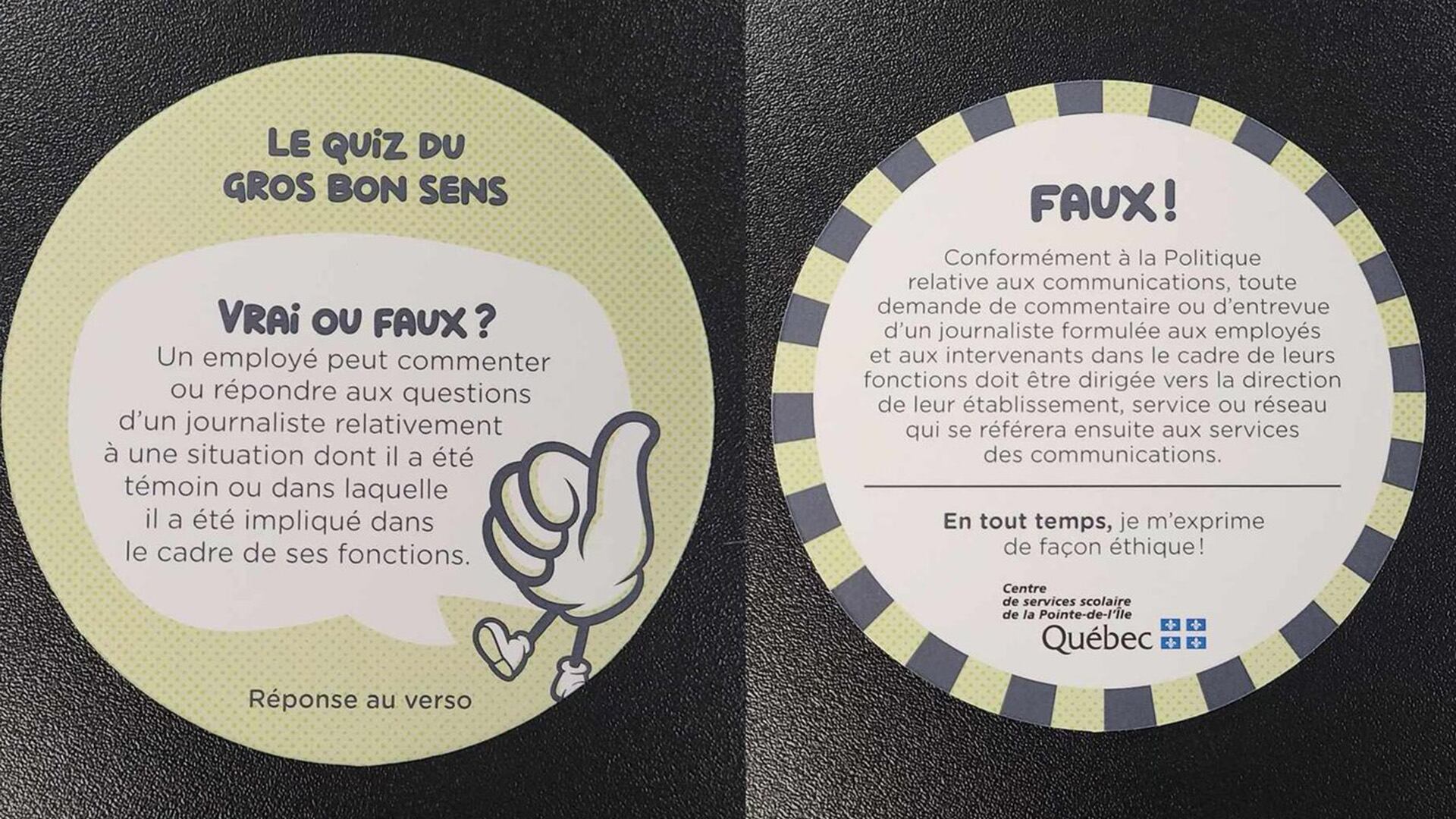 «Dans l'idée d’accompagner nos employés sur certaines questions éthiques, nous avons créé un jeu-questionnaire dont les mises en situation se basent sur de vraies décisions tranchées par des tribunaux, le Code civil du Québec ou notre Politique des communications», écrit la porte-parole du centre de services de la Pointe-de-l’Île, Valérie Biron, dans un courriel à La Presse Canadienne.