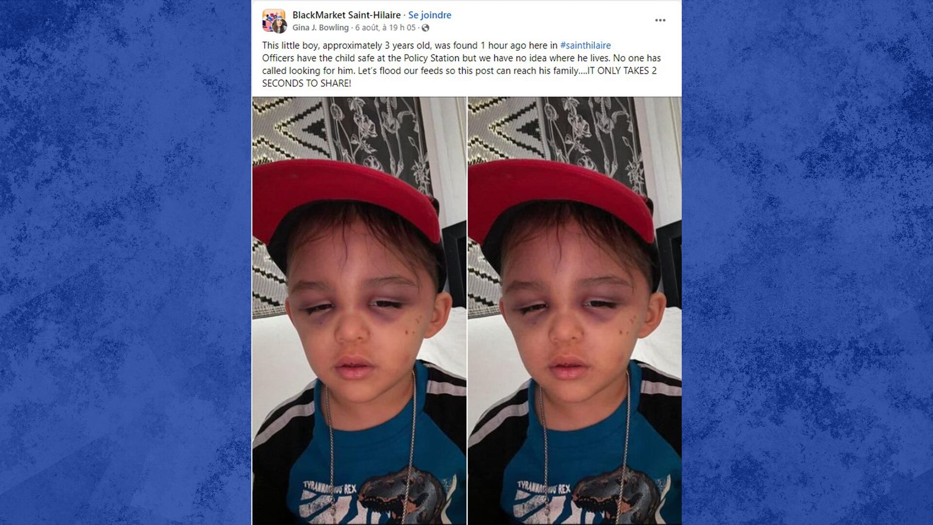 Ces derniers jours, des publications du genre se sont multipliées dans plusieurs groupes Facebook locaux de municipalités comme Mont-Saint-Hilaire et Lambton, au Québec, mais aussi aux États-Unis ou dans d’autres provinces canadiennes. On y affirme qu’un petit garçon de trois ans aurait été retrouvé une heure plus tôt dans la municipalité. Il aurait été amené au service de police, mais on ne saurait pas qui sont ses parents.