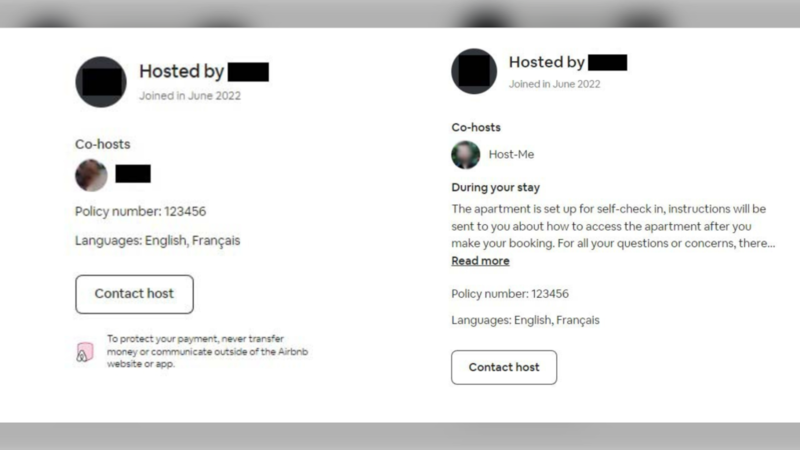 Deux annonces Airbnb à Montréal à des emplacements distincts, gérées par le même hôte, indiquent 123456 comme numéros de confirmation. Plusieurs autres annonces de l'hôte incluent également ce numéro. | Crédit image - CTV News