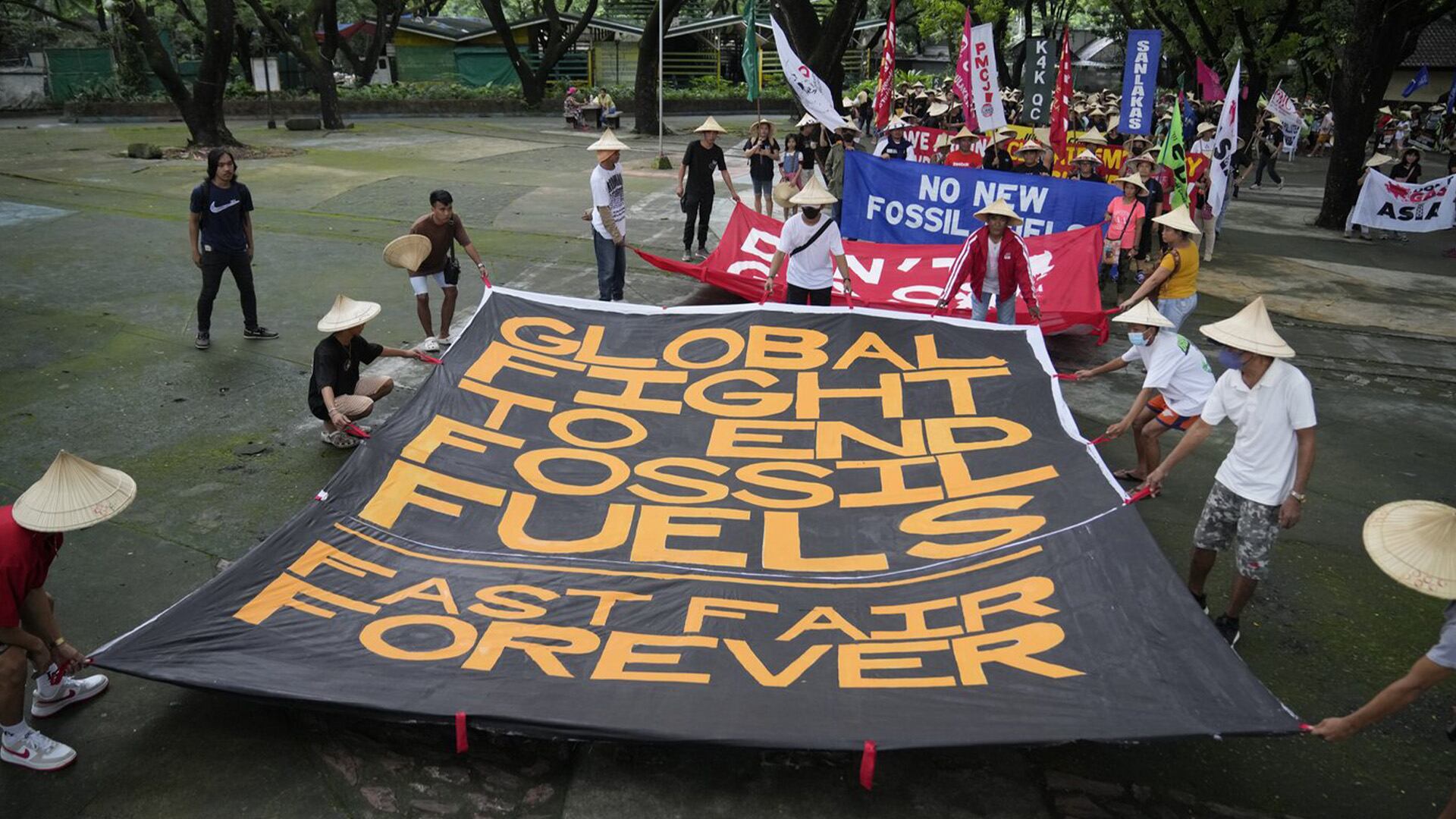 Lors d’une manifestation à Quezon City, aux Philippines, des militants se sont allongés devant le ministère de l’Environnement et des Ressources naturelles en signe de protestation et ont brandi des pancartes demandant l’abandon progressif des combustibles fossiles, du charbon au gaz naturel.