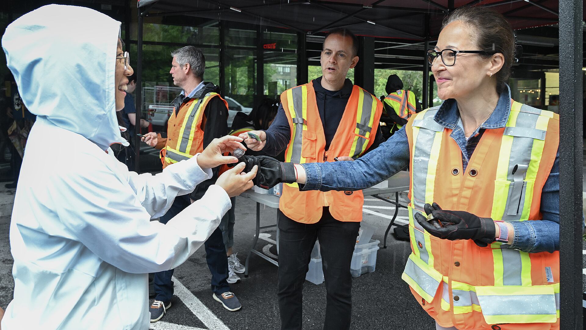 Dès 9 h 30 dimanche, piétons et automobilistes ont bravé la pluie battante pour aller récupérer l'un des 2000 rivets souvenirs de l'ancien pont qui ont été distribués à L'Île-des-S?urs. Un premier lot de 2000 rivets avait été rendu disponible samedi à Brossard.
