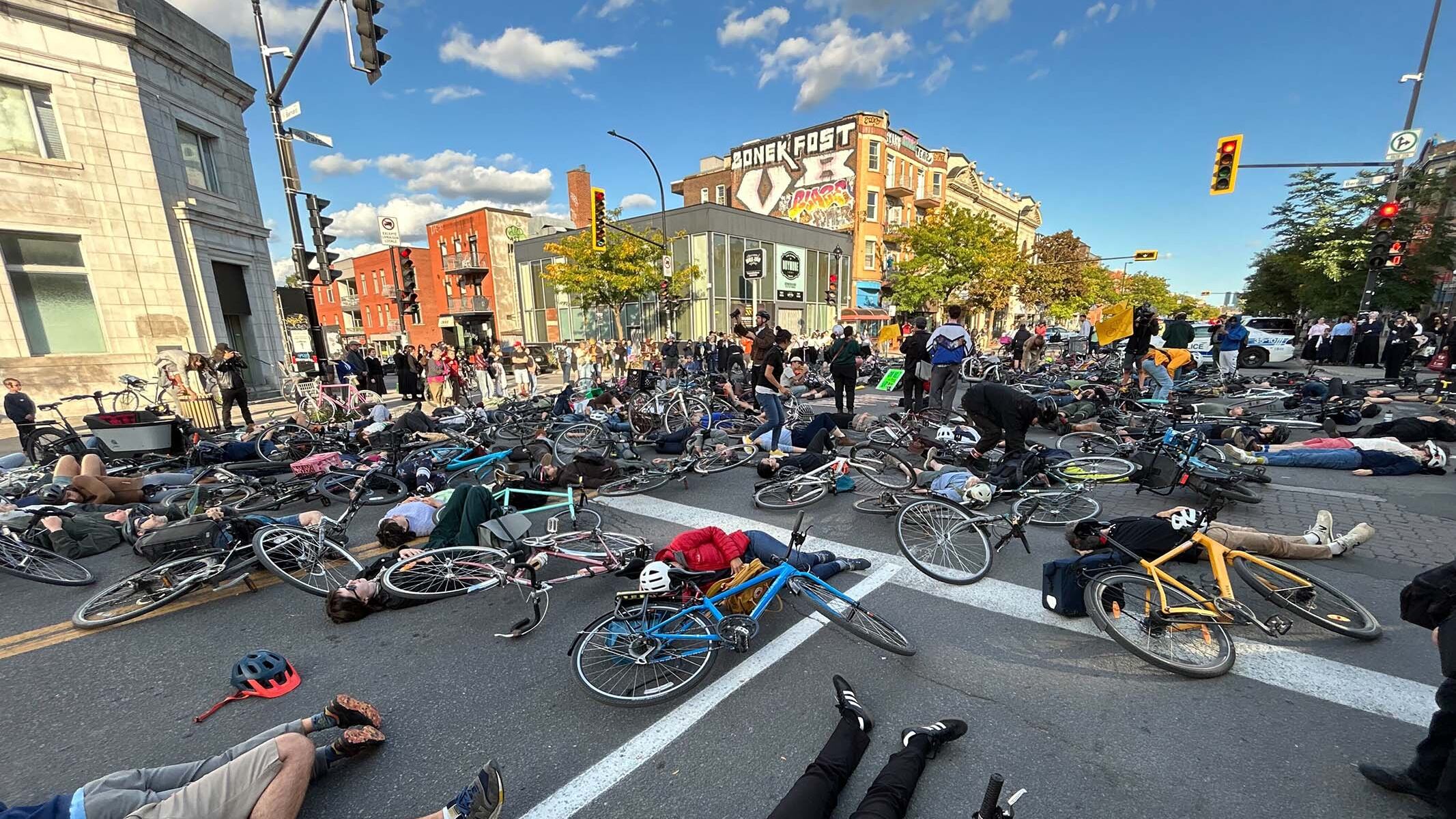 Des dizaines de cyclistes se sont rassemblés lundi à Montréal pour un die-in symbolique afin d'attirer l'attention sur une route particulièrement dangereuse pour les cyclistes et les piétons.