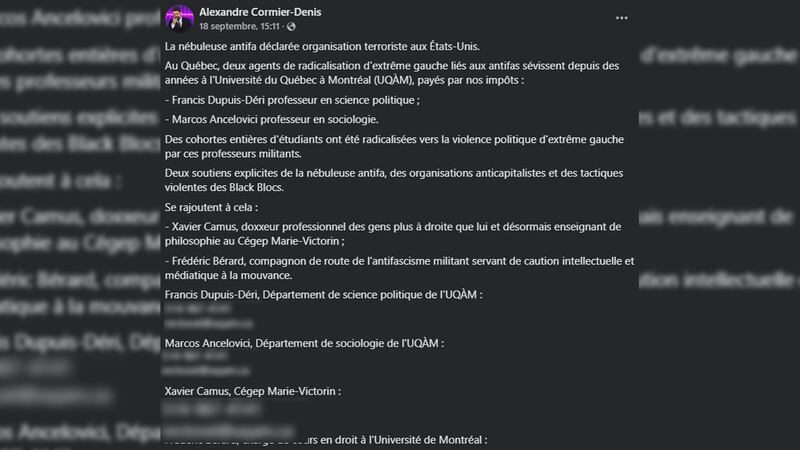 «Il met les quatre photos [des enseignants] et dit que je suis une caution intellectuelle et médiatique pour les antifascistes. Il explique que j’enseigne la violence d’extrême gauche à des cohortes d’étudiants depuis 2003. Il met les coordonnées de l’Université et celle du recteur pour interpeller les gens et les inviter à me faire congédier.»
