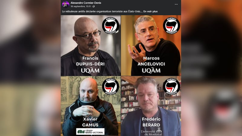 M. Cormier-Denis a écrit que le professeur à la faculté de droit de l’Université de Montréal radicalise ses étudiants «vers la violence politique d'extrême gauche», à l’instar de plusieurs autres professeurs québécois qu’il a dénoncés sur Facebook.