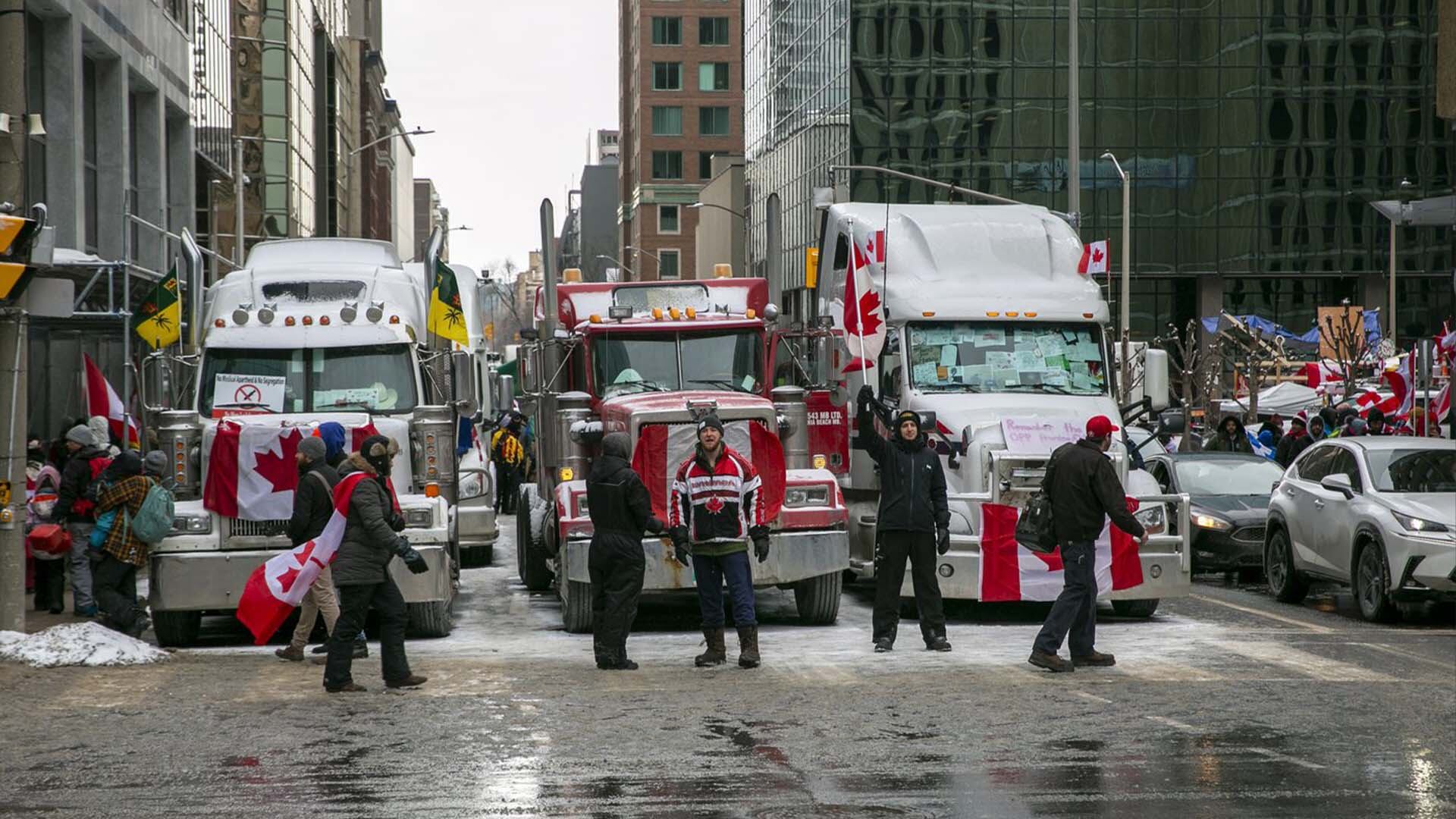 Des policiers restreignent l'accès aux rues autour de la colline du Parlement pour mettre fin à une manifestation, qui a commencé en opposition aux mandats obligatoires de vaccination contre la COVID-19 et s'est transformée en une manifestation antigouvernementale plus large et occupation à Ottawa, le 19 février 2022. Justin Tang | La Presse canadienne.