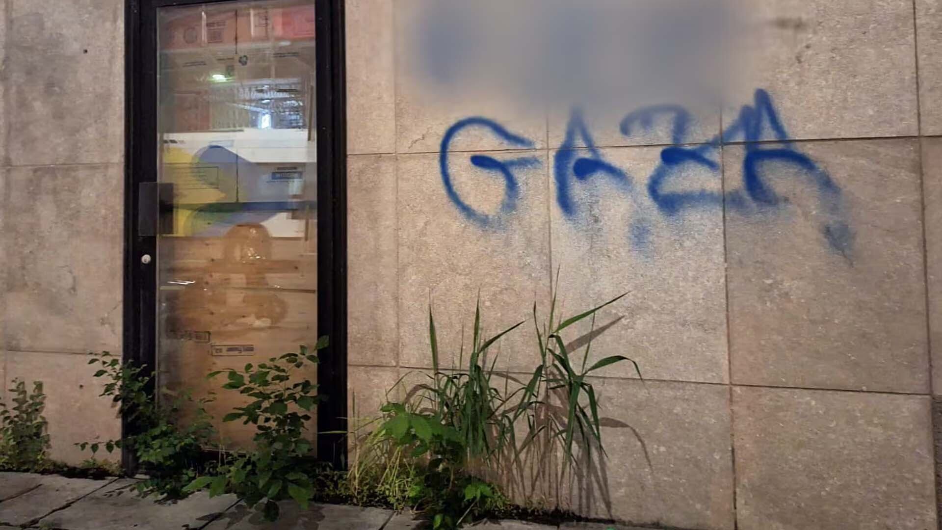 Les mots «F*** Gaza» ont été écrits avec de la peinture en aérosol bleue sur le bâtiment à trois endroits.