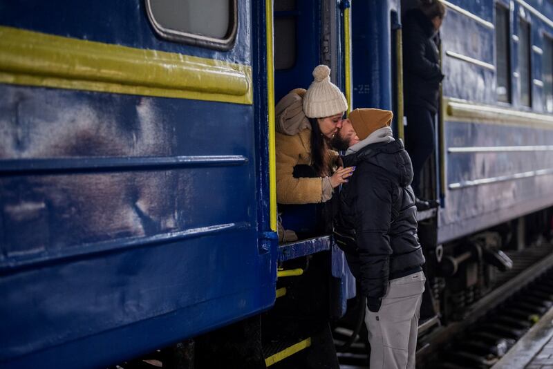 Stanislav, 40 ans, embrasse sa femme Anna, 35 ans alors qu’elle fuit l'Ukraine pour trouver refuge dans un pays voisin. | Crédit photo - Emilio Morenatti