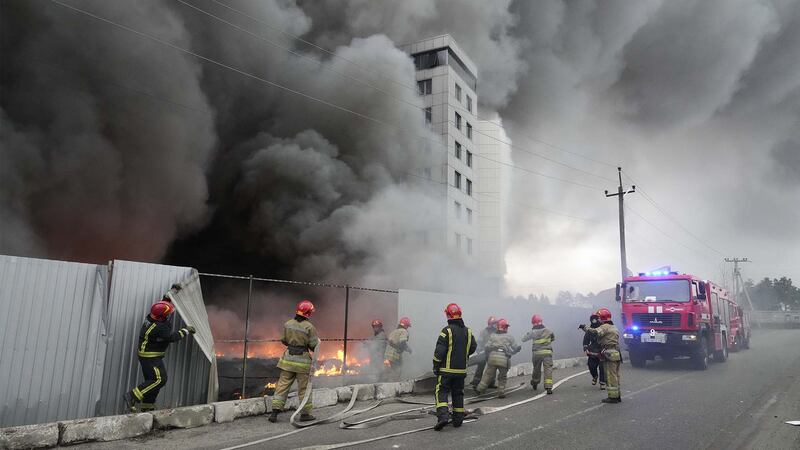 Les pompiers travaillent pour éteindre un incendie dans un centre logistique endommagé après un bombardement à Kyiv, en Ukraine, le jeudi 3 mars 2022. | Crédit photo - Efrem Lukatsky pour l'Associated Press