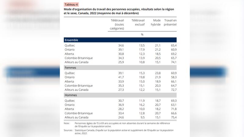 Le taux de télétravail demeure toutefois plus élevé au Québec qu'en Alberta (30,8 %) ou qu'ailleurs au Canada (25,9 %), «encore une fois à cause des différences dans la répartition de l'emploi entre les industries.»