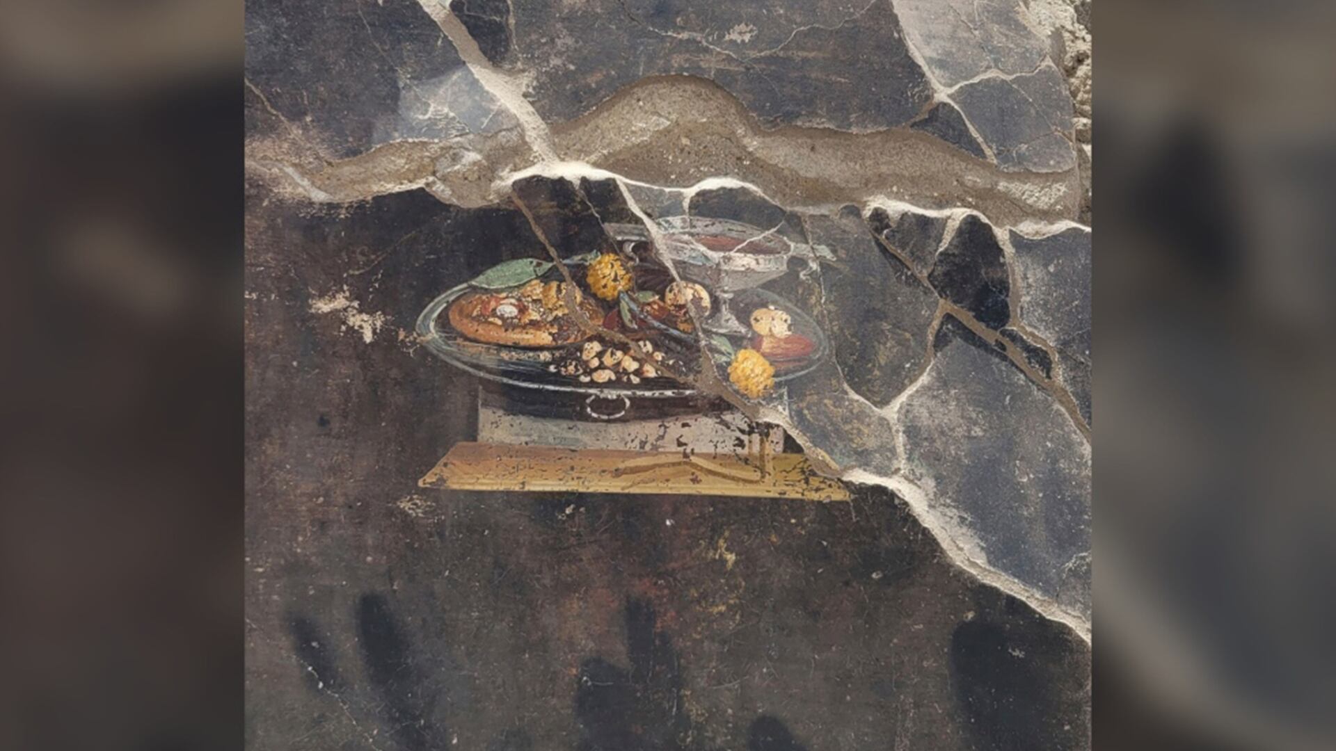Le site archéologique de Pompéi a annoncé les résultats de leurs fouilles dans la Regio IX, ensevelie en 79 après J.-C., où ils ont découvert cette fresque murale représentant une nature morte. Les archéologues pensent que la peinture illustre une focaccia agrémentée de grenades, de dattes, de pesto et de diverses autres épices et condiments. Le pain plat est également accompagné sur le plateau en argent de divers fruits secs et d'une coupe de vin.