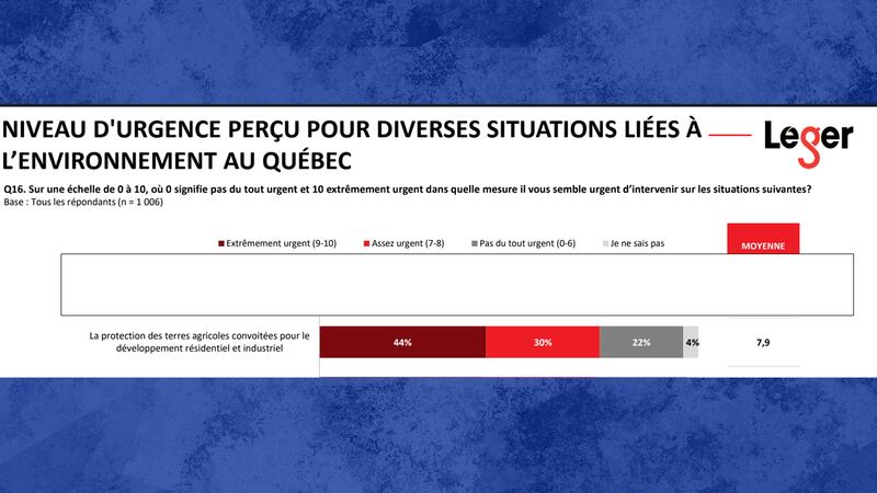 Le coup de sonde — mené du 28 septembre au 2 octobre 2023 auprès de 1006 répondants — indique que 74 % des Québécoises et des Québécois considèrent qu'il est urgent d’intervenir afin d’assurer la protection des terres agricoles convoitées pour le développement résidentiel et industriel.