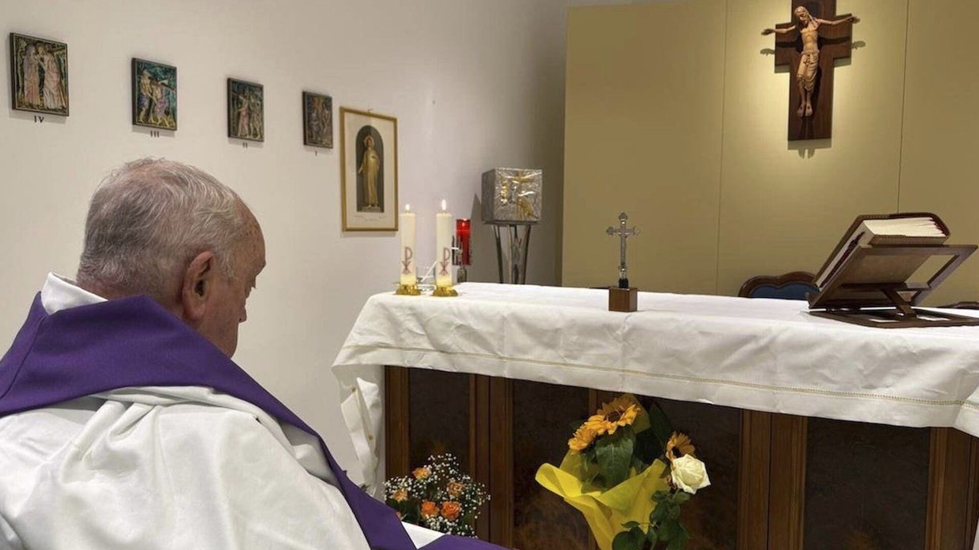 Le Vatican a publié dimanche la première photo du pape depuis plus d'un mois, montrant François concélébrant la messe dans la chapelle de l'hôpital. La photo est prise de dos et montre le pape François portant une étole violette, assis dans un fauteuil roulant devant un autel.