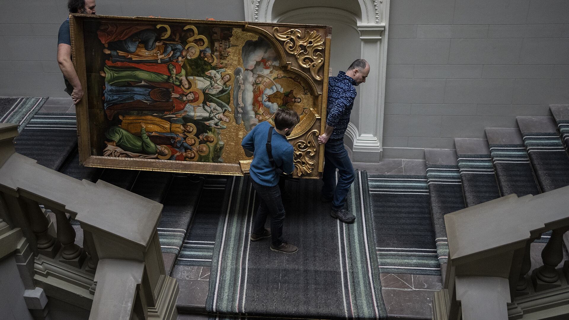Dans une galerie partiellement vide du musée national Andrey Sheptytsky, à Lviv, des employés placent des pièces baroques emballées dans des boîtes de carton. À quelques mètres de là, un groupe descend un élément important de l'iconostase de Bohorodchany, une œuvre d'art sacré du XVIIIe siècle.