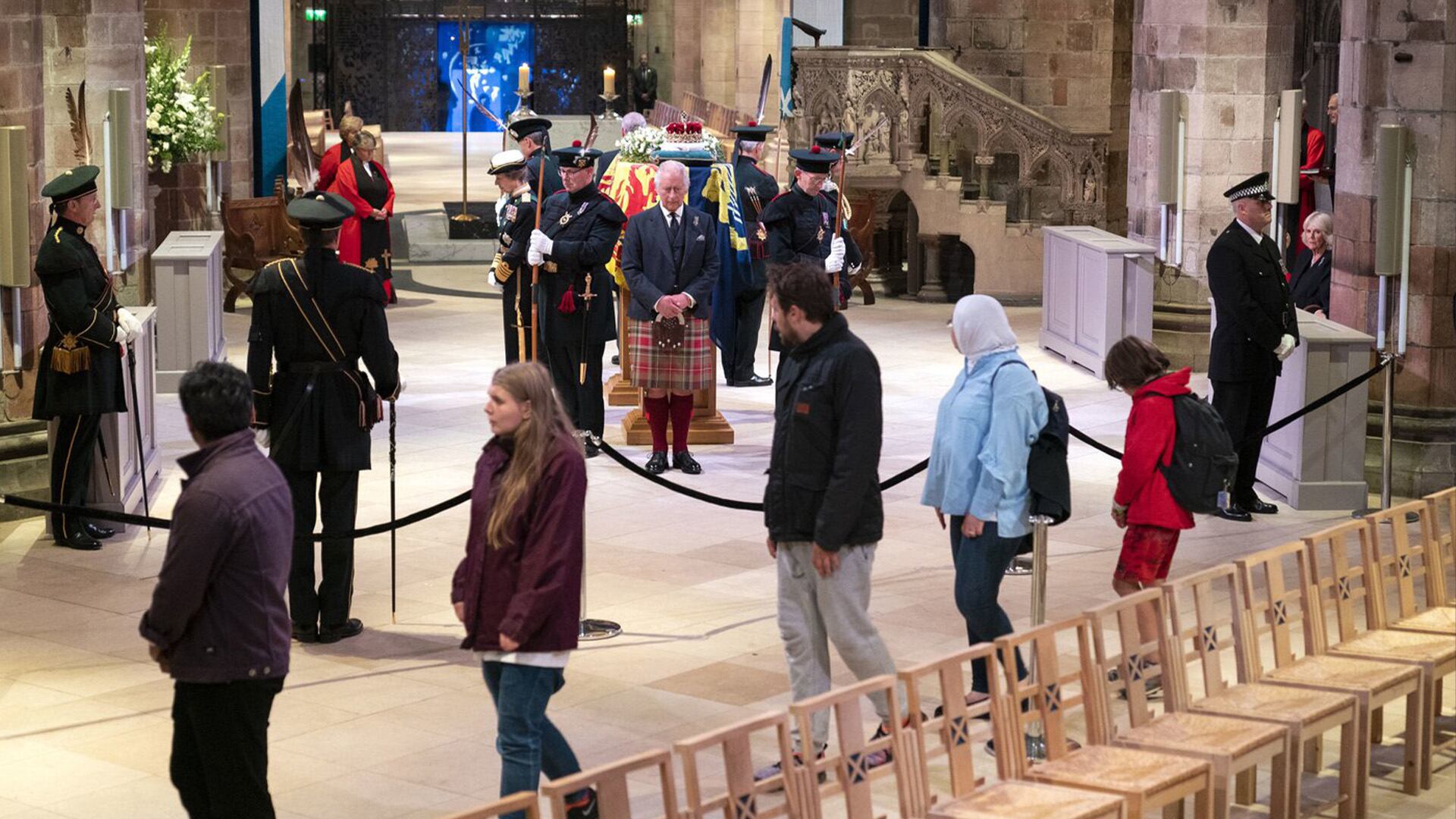 La veille, Charles, ses frères et sa sœur, Anne, Andrew et Edward, la tête baissée, se sont brièvement recueillis autour du cercueil de la reine Élisabeth II dans la cathédrale Saint-Gilles à Édimbourg alors que les membres du public défilaient.