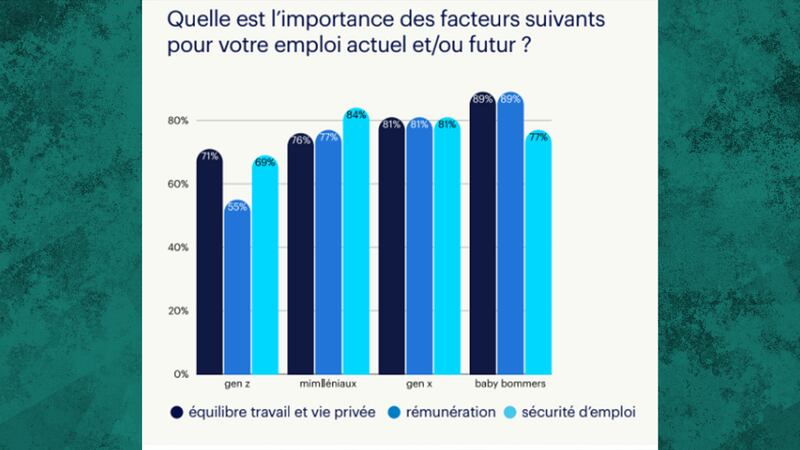 Par exemple, une plus grande proportion des personnes sondées appartenant à la génération Z affirment que l'équilibre travail et vie privée est plus important que la rémunération et dans une plus mince marge, la sécurité d'emploi.