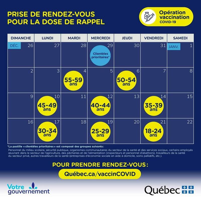 Québec accélère par ailleurs la vaccination en permettant dès maintenant à de nouveaux groupes prioritaires, dont le personnel en milieu scolaire, de prendre rendez-vous pour une 3e dose. Le plan de vaccination des prochaines semaines a aussi été dévoilé. Encore une fois, ce sera fait par tranche d’âge à compter du 4 janvier. Des catégories s’ajoutent aux 2 ou 3 jours, si bien qu’à la fin de janvier, toutes les personnes de 18 ans et plus pourront prendre rendez-vous.