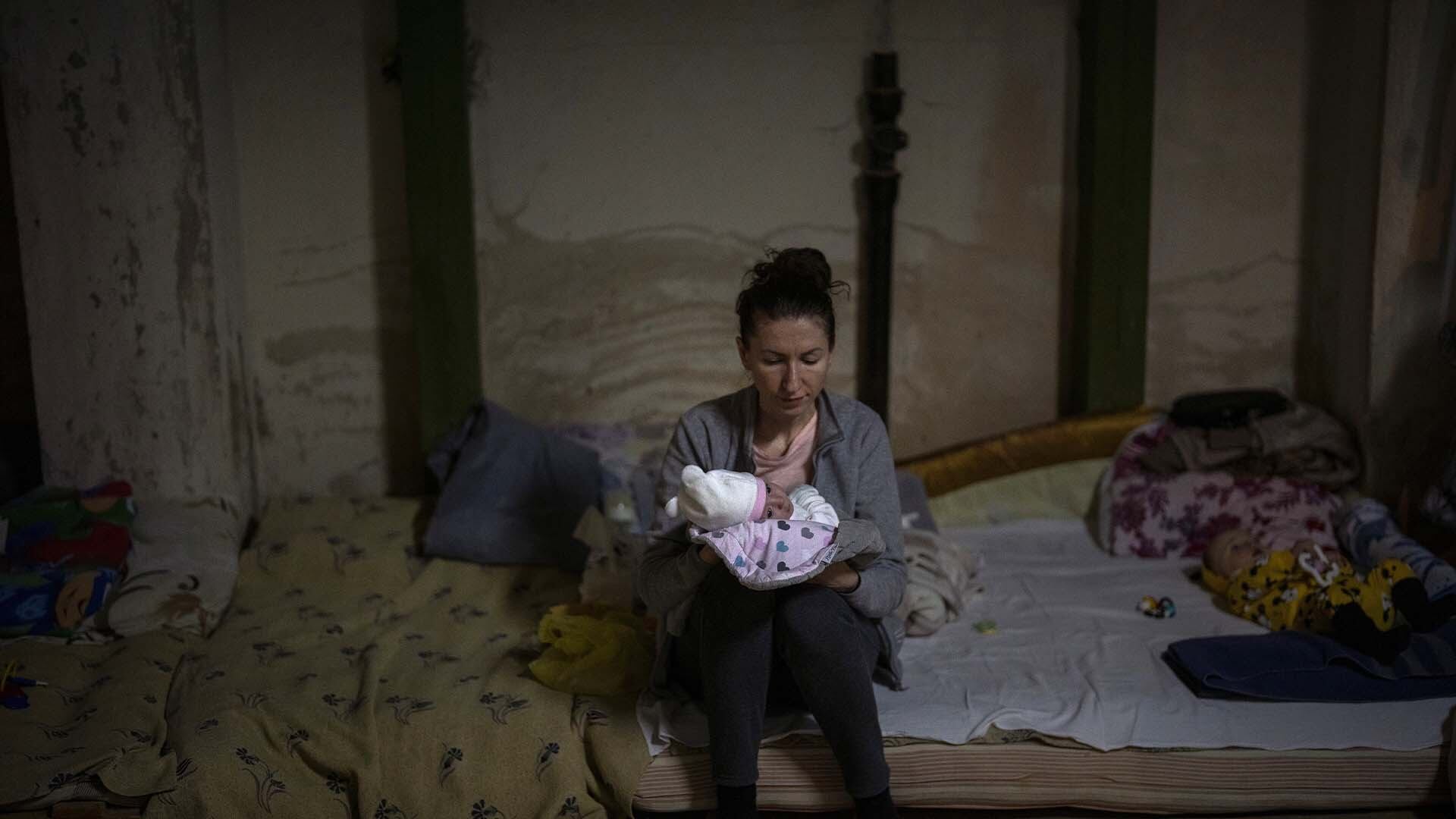 Dans le sous-sol miteux de l'hôpital pour enfants Okhmadet à Kiev, les mères et les bébés trouvent le confort qu'ils peuvent sur des lits et des couvertures de fortune disposés de chaque côté de l'allée en béton.