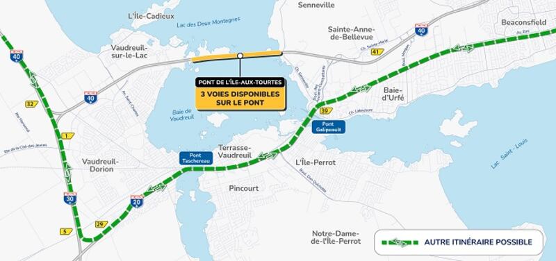 Dès lundi prochain le 27 novembre, il restera seulement 3 voies de circulation sur ce pont qui relie Montréal et Vaudreuil. Deux de ces trois voies seront ouvertes pour favoriser la circulation d'un maximum de véhicules aux heures de pointe, soit 2 voies vers Montréal et une vers Vaudreuil le matin et l'inverse pour le retour à la maison l'après-midi.