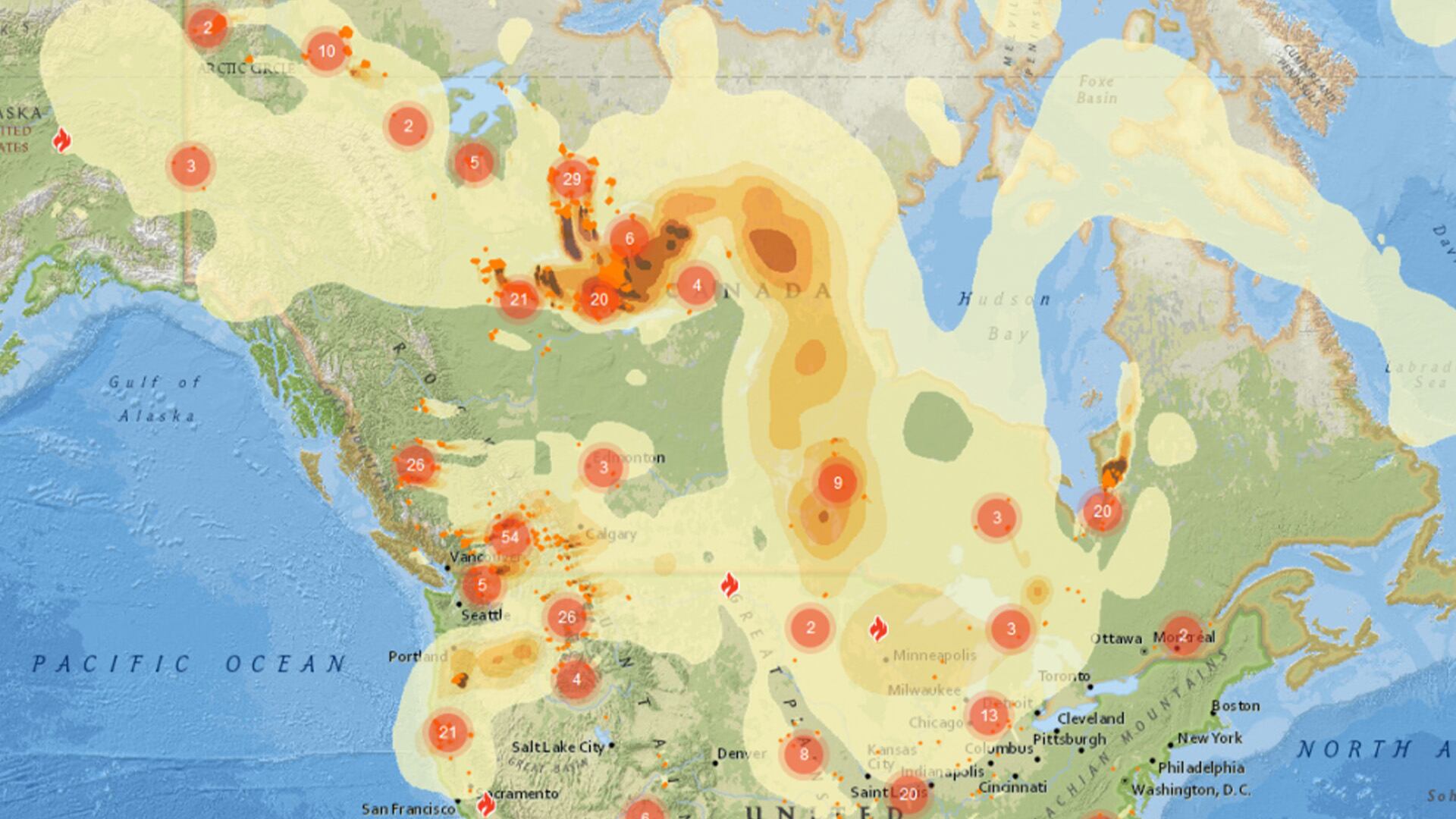 D'ici vendredi soir, l'Ontario devrait être recouvert de fumée provenant des incendies de Yellowknife. La majeure partie du Québec, à l'exception de la région de Montréal, devrait éviter la pollution.