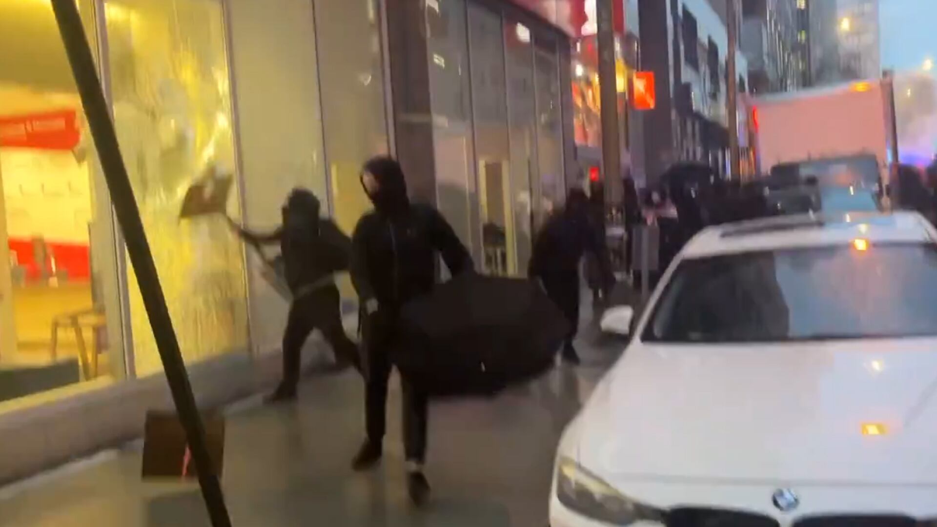 Des images circulant sur les réseaux sociaux montrent des personnes briser les vitrines d’une succursale de la Banque Scotia à coups de panneau de signalisation.