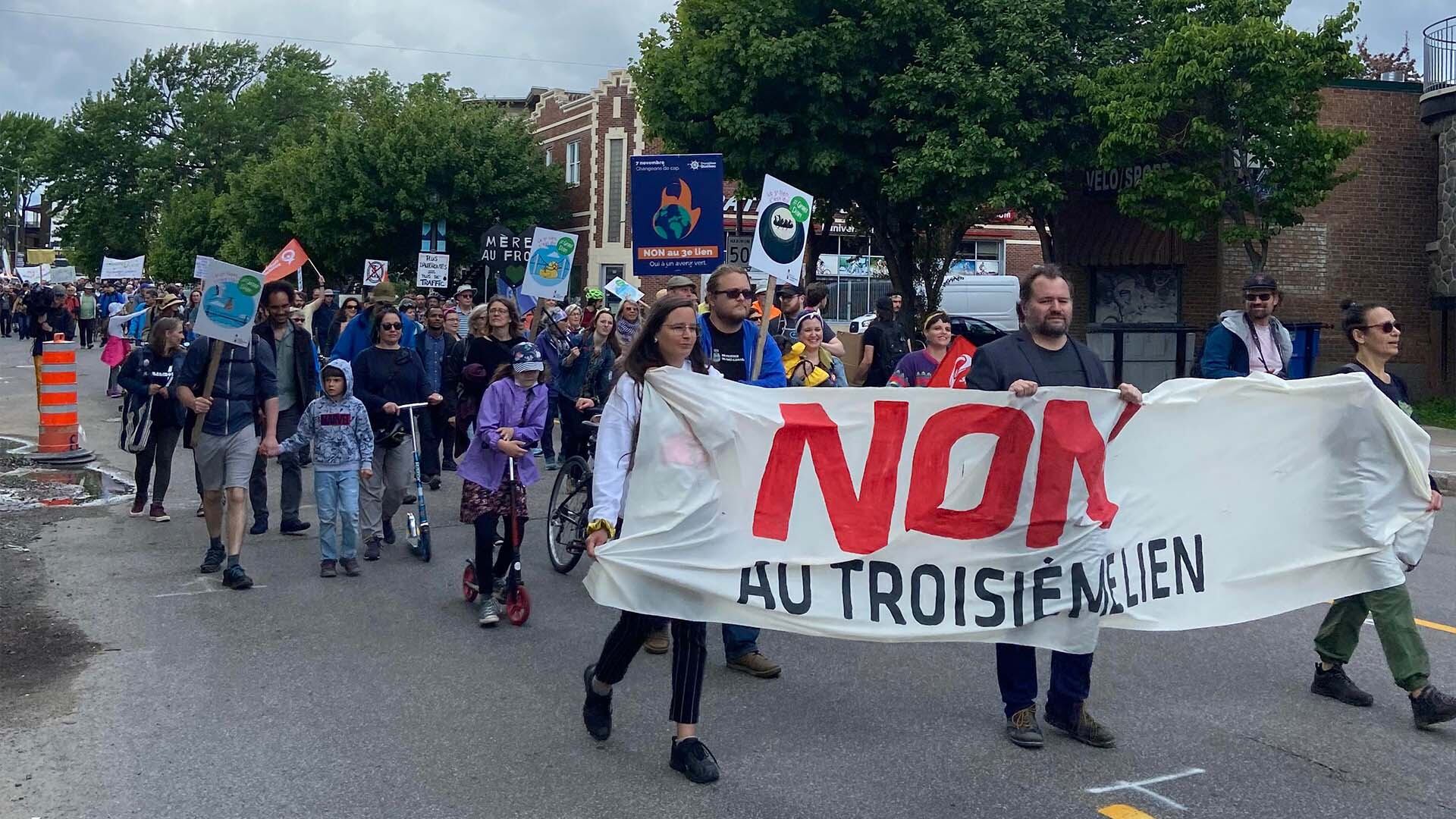 L'évènement était organisé par la Coalition Non au troisième lien. Ils ont marché de la place Jean-Béliveau jusqu'au pôle Saint-Roch.