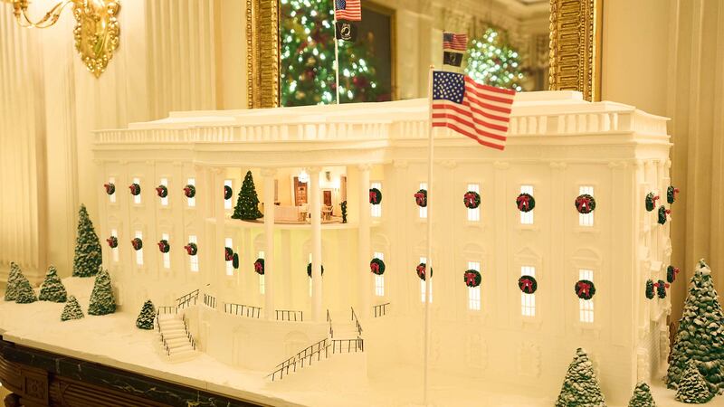 Point culminant des fêtes, la Maison-Blanche en pain d'épices exposée dans la salle à manger d'apparat montre le portique sud du manoir et offre un aperçu spécial de la salle ovale jaune, un salon situé près du balcon Truman dans les appartements privés du président au deuxième étage.