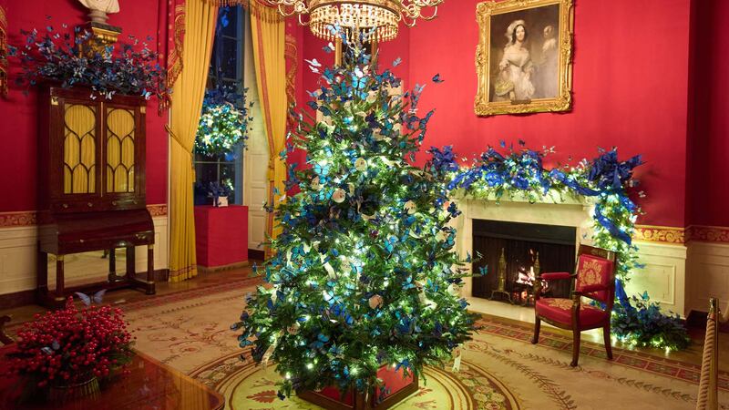 Des milliers de papillons bleus décorent la salle rouge, où le sapin central rend hommage aux jeunes et à l'initiative Fostering the Future de Melania Trump, qui soutient les personnes ayant été placées en famille d'accueil dans le cadre de son programme Be Best axé sur les enfants.