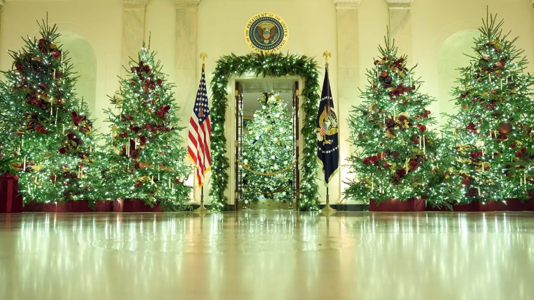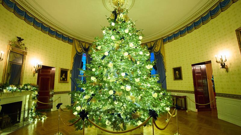 Le sapin de Noël officiel de la Maison-Blanche, situé dans la salle Bleue, est décoré d'étoiles dorées en l'honneur des familles qui ont perdu un membre pendant son service militaire actif. Ce sapin rend traditionnellement hommage à chaque État et territoire d'une manière ou d'une autre, et celui de cette année est chargé d'ornements représentant l'oiseau et la fleur officiels de chacun d'entre eux.