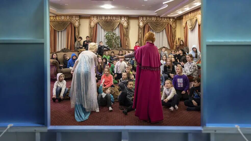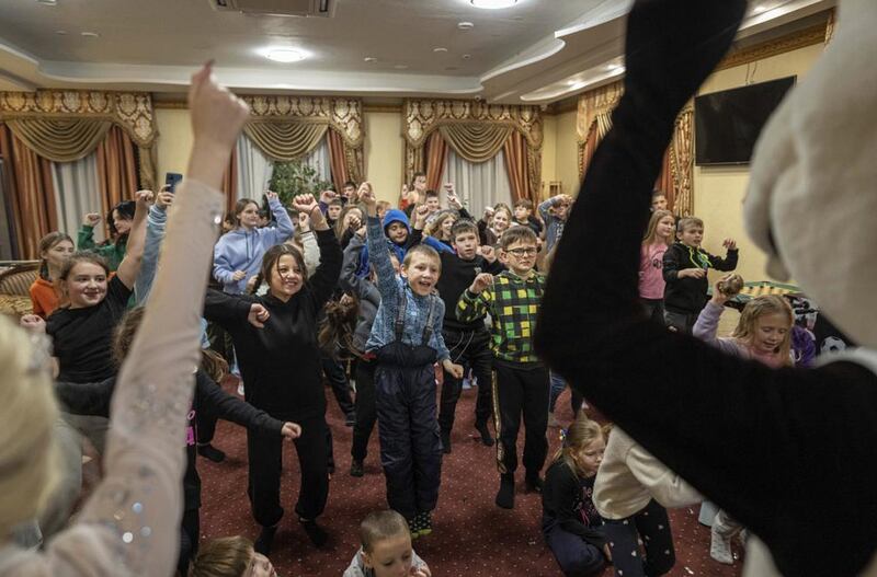 Dans une salle de réunion recouverte de moquette dans ce qui était autrefois un hôtel chic, des enfants ukrainiens crient de bonheur devant un spectacle mis en scène pour eux et face à la joie d'ouvrir des cadeaux.