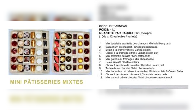 Selon un avis publié par l'Agence canadienne d'inspection des aliments, le rappel porte sur des boîtes de quatre kilogrammes et des plateaux d'un kilogramme de mini-pâtisseries Sweet Cream dont la date de péremption est comprise entre le 17 juin 2025 et le 15 novembre 2025 inclus.