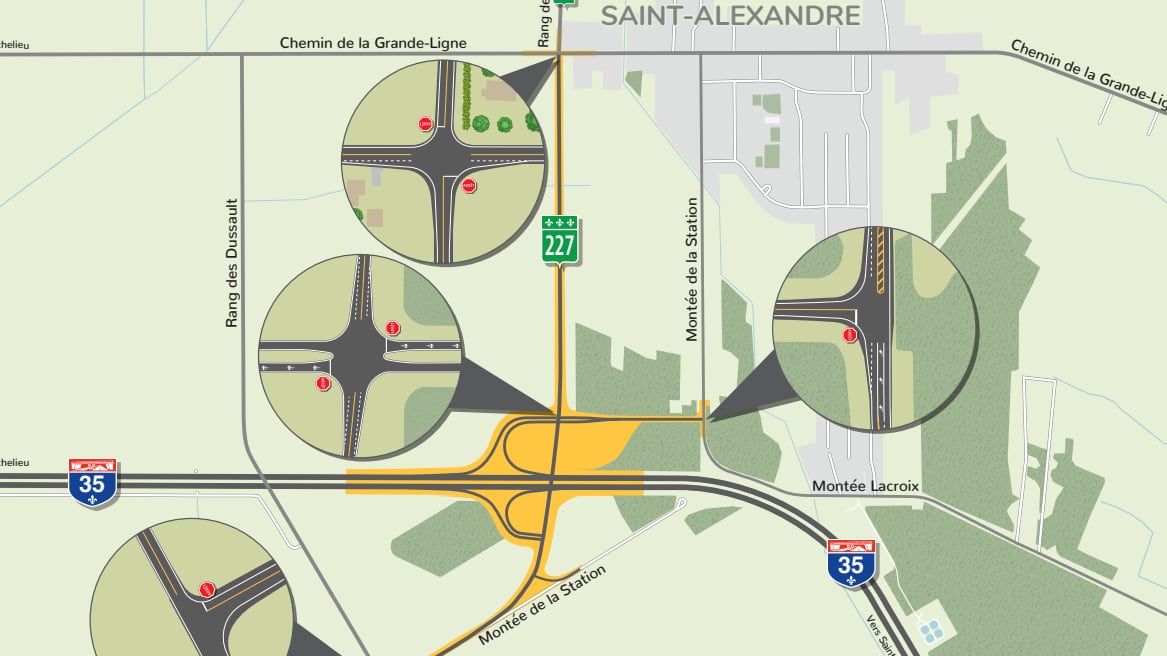 Le projet, comprend la construction de l’échangeur de l’autoroute 35 vis-à-vis du rang des Soixante, le prolongement de la route 227, dans ce même axe, entre le chemin de la Grande-Ligne et l’autoroute 35 et la construction d’un chemin de desserte reliant l’échangeur à la montée de la Station.