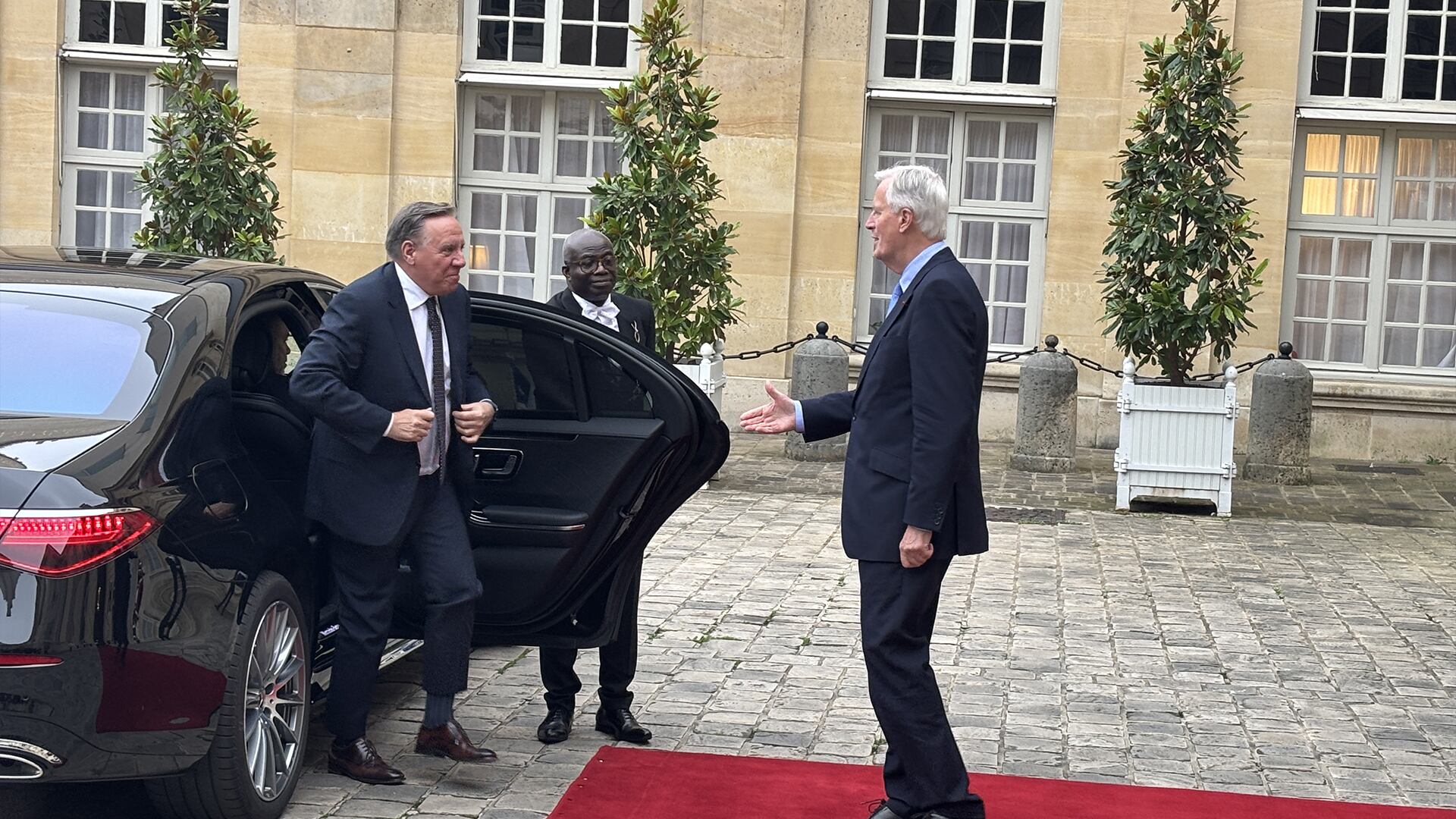 M. Legault, qui est le premier chef de gouvernement que M. Barnier recevait à Matignon, a été accueilli avec les grands honneurs: tapis rouge et garde républicaine alors que sa voiture faisait son entrée dans la cour d'honneur.