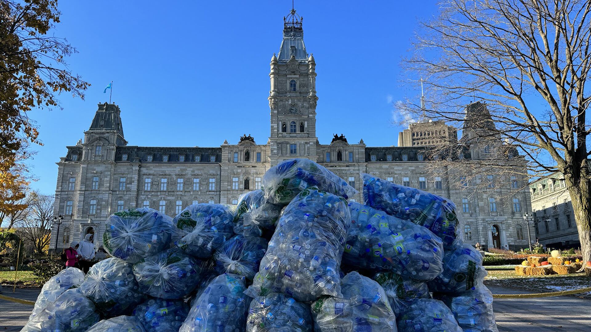 Équiterre a déposé, mardi matin, plus de 6000 bouteilles de plastique devant l’Assemblée nationale à Québec pour demander au gouvernement Legault de bonifier sa réforme de la consigne.