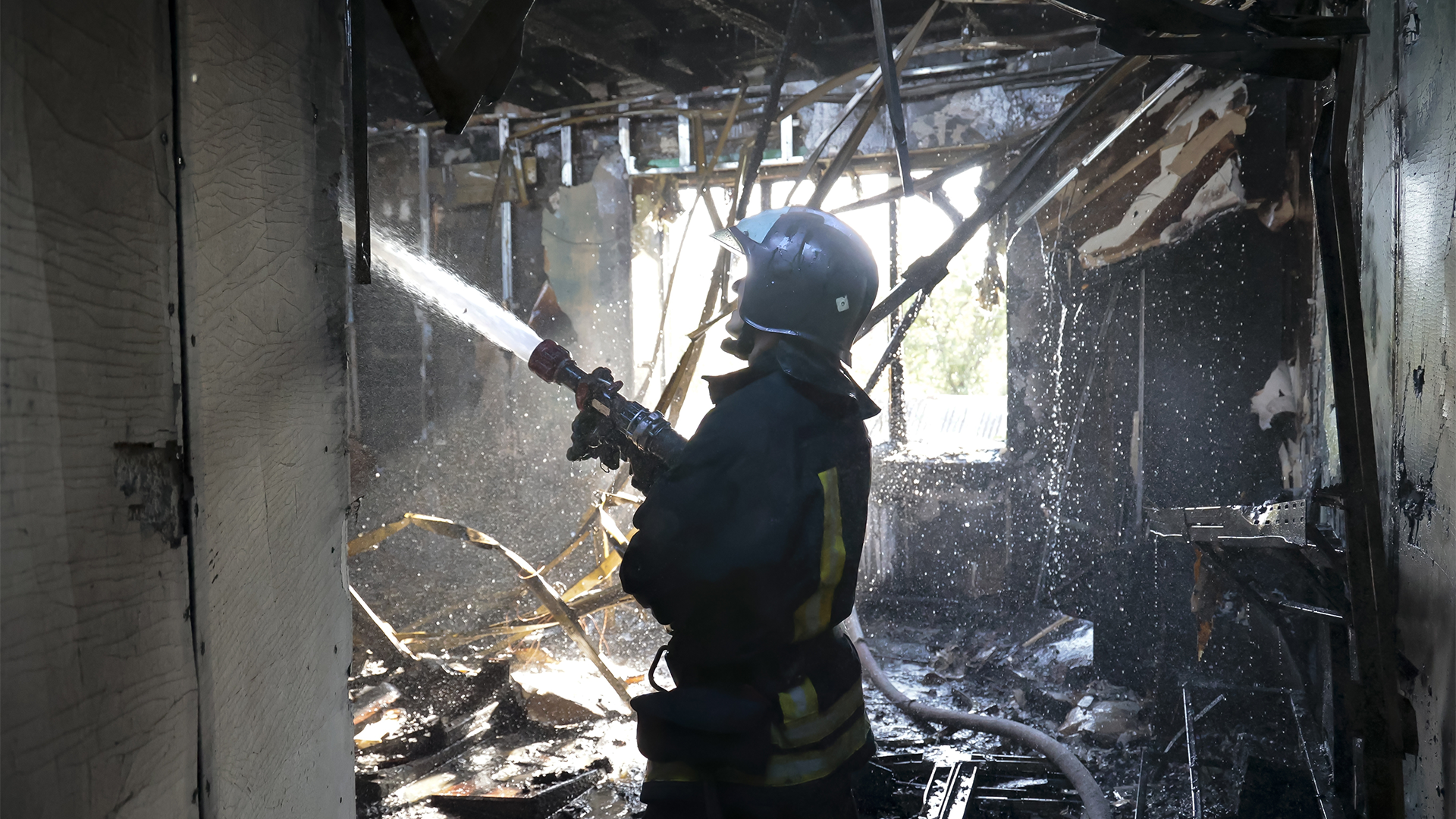 Le bâtiment municipal de Donetsk, contrôlé par les séparatistes, a été gravement endommagé par l'attaque à la roquette. Des panaches de fumée tourbillonnaient autour du bâtiment, avec des rangées de fenêtres soufflées et un plafond partiellement effondré. Les voitures à proximité ont brûlé.