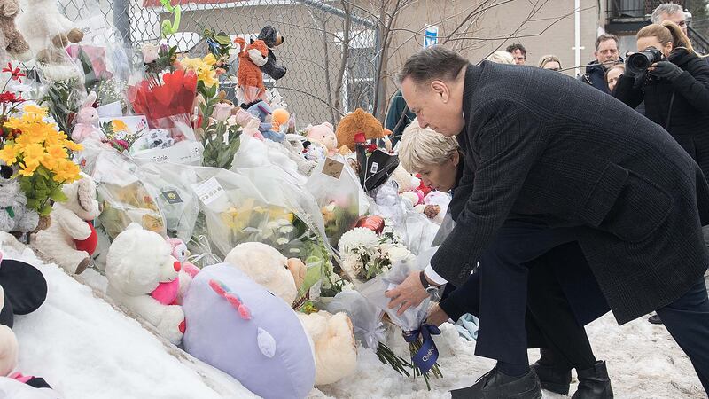 Le premier ministre, accompagné de sa femme Isabelle Brais, a déposé une gerbe de fleurs devant la garderie où deux bambins sont morts et six ont été blessés, mercredi, après qu'un homme a percuté le bâtiment du servicede garde avec un autobus de la Société de transport de Laval (STL).