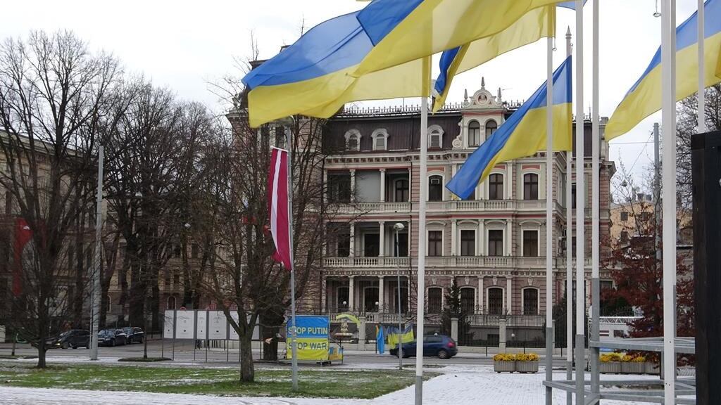 On peut voir le drapeau ukrainien flotter partout, ou presque, dans les quartiers centraux de Riga, en Lettonie.