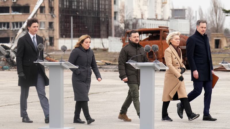 M. Trudeau est apparu à l’aéroport d’Hostomel aux côtés de la présidente de la Commission européenne Ursula von der Leyen, de la première ministre italienne Giorgia Meloni et du premier ministre belge Alexander De Croo dans une manifestation de solidarité mondiale.
