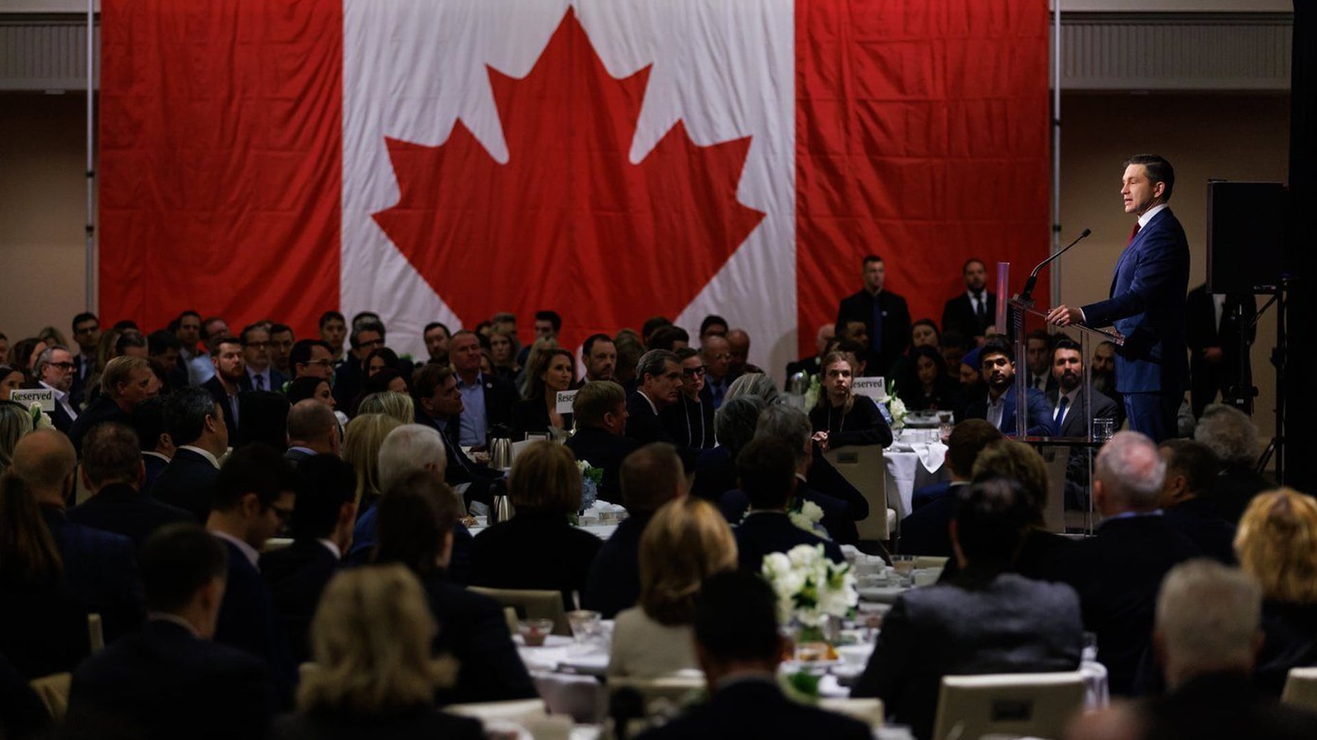 Avant de prononcer un discours à Toronto dans la matinée, Poilievre a été présenté par Caroline Mulroney, ministre du gouvernement progressiste-conservateur de l'Ontario et fille de l'ancien premier ministre Brian Mulroney, qui a contribué à l'adoption de l'accord de libre-échange initial avec les États-Unis.