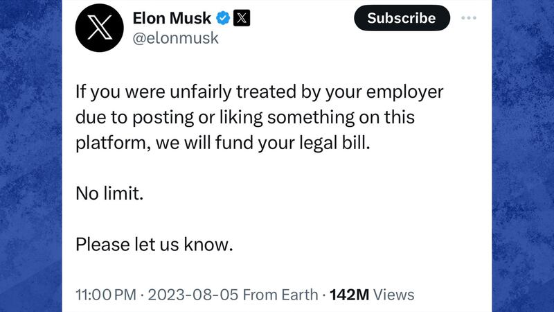 En août dernier, M. Musk a publié un message sur X dans lequel il promettait de financer les frais de justice de toute personne ayant été «traitée injustement» par son employeur «pour avoir publié ou aimé quelque chose sur cette plateforme».