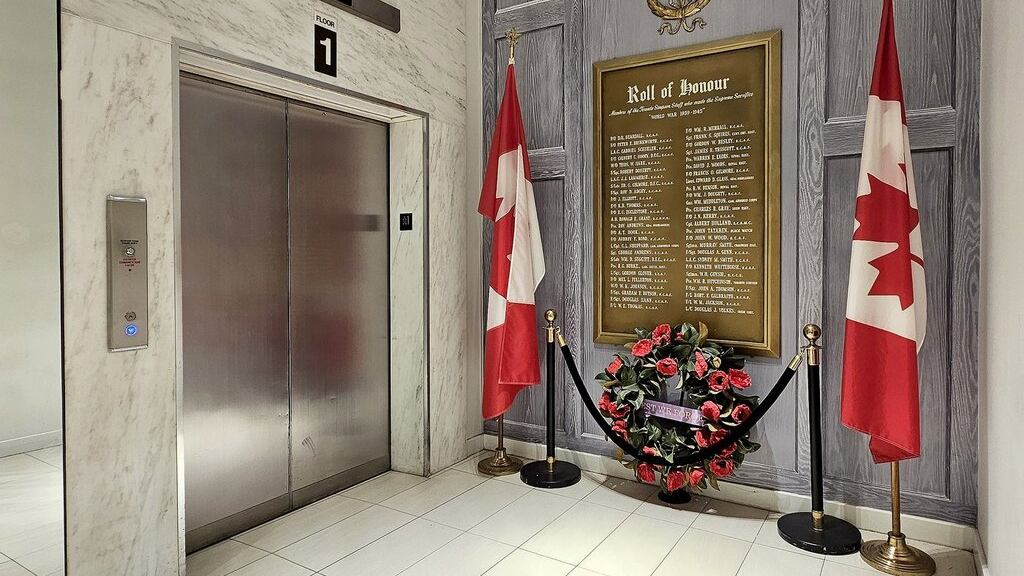 La plaque commémorative du magasin de Toronto présente la liste des employés de Simpsons –un grand magasin désaffecté que La Baie a racheté en 1978– qui ont fait le «sacrifice suprême». Celle-ci est disposée près des ascenseurs, est encadrée de deux drapeaux canadiens et d'une couronne de coquelicots surmontée d'une bannière violette sur laquelle on peut lire «N'oublions jamais».